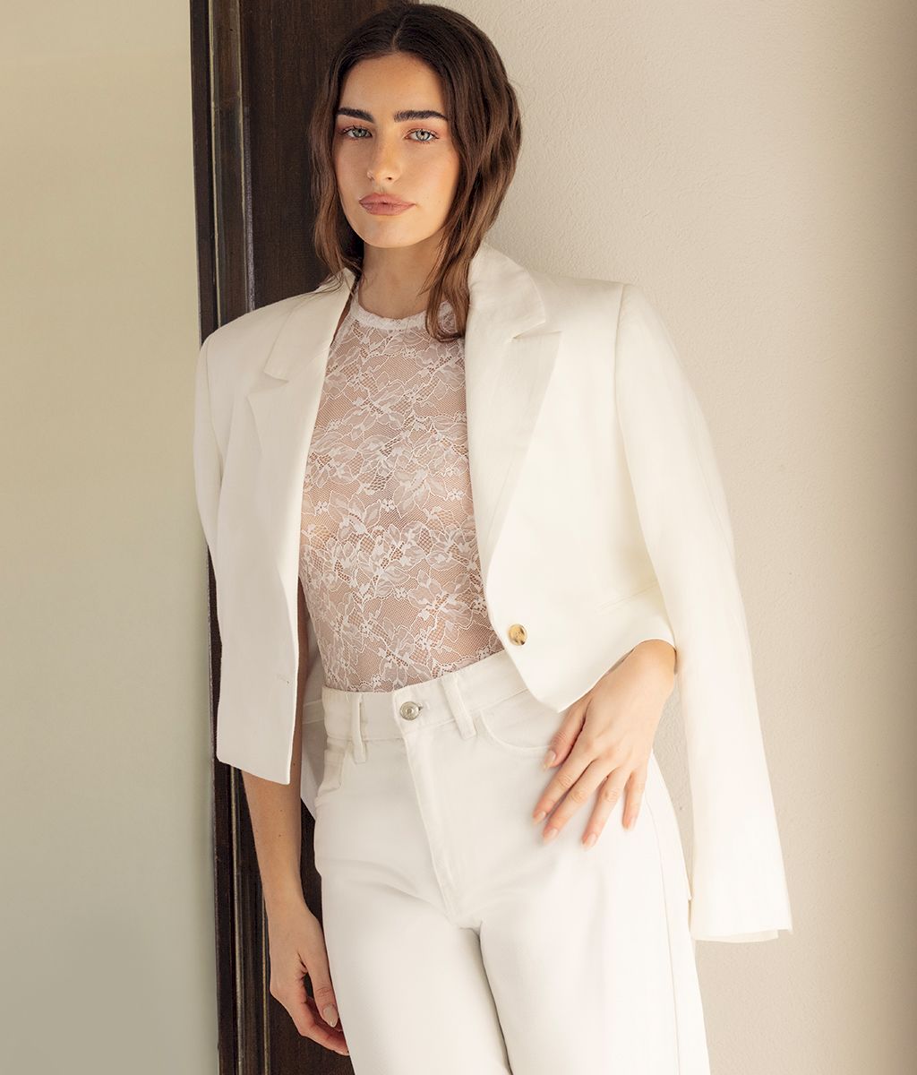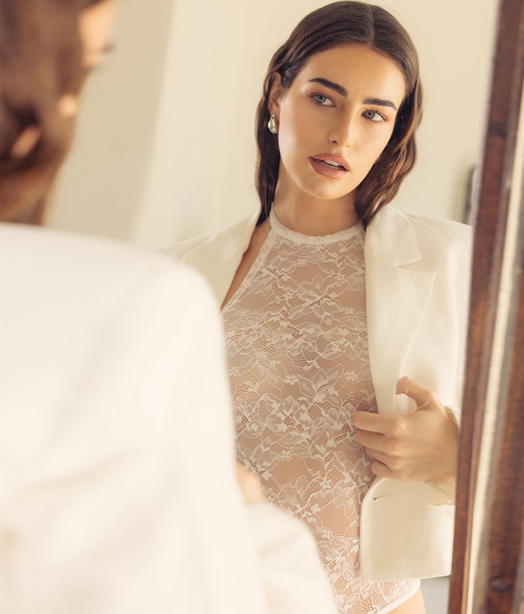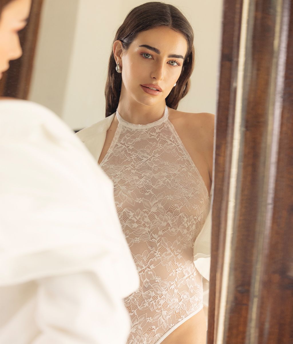 Body en Encaje. Transparencia. Cuello Halter con bot贸n a presi贸n. Colaless, abrocha por debajo con broches a presi贸n. Marca Mel铆fera. Composici贸n: 80% Algod贸n, 20% Elastano. ATENCI脫N: Prenda no apta para lavarropas. No lavar a seco. No retorcer. Lavar a mano con agua fr铆a. Esta prenda puede producir peeling por fricci贸n.